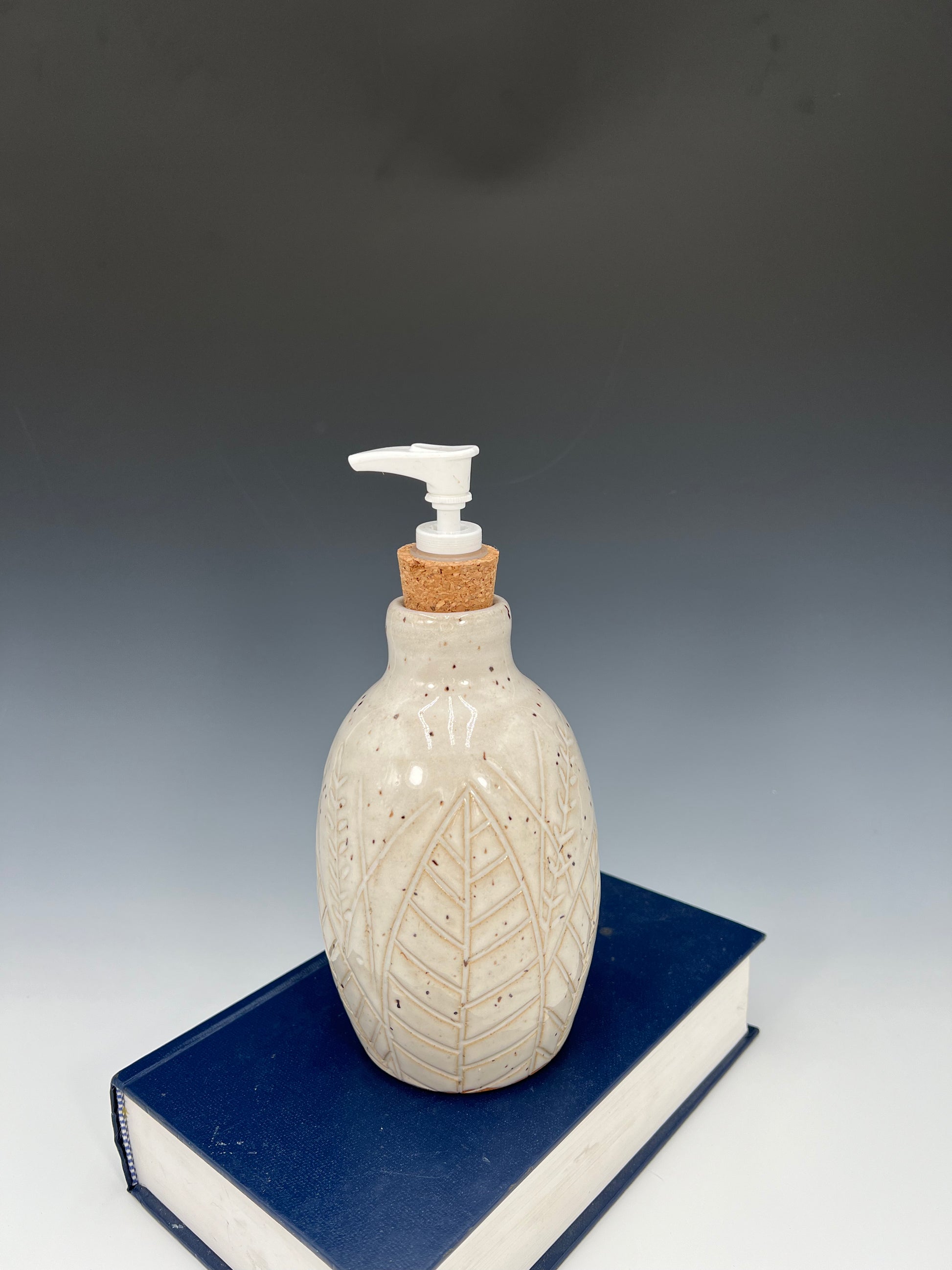 This stoneware soap dispenser is hand carved with a botanical theme, featuring a clean white glaze.